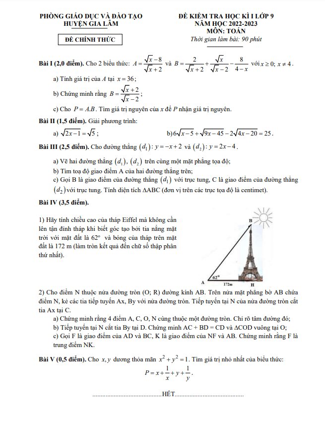 Đề kiểm tra học kì 1 Toán 9 năm 2022 – 2023 phòng GD&ĐT Gia Lâm – Hà Nội