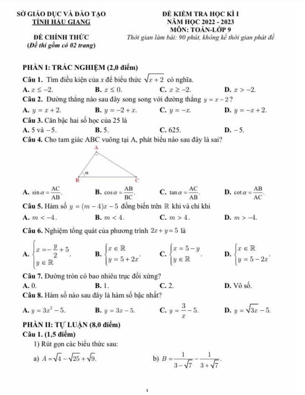 Đề kiểm tra học kì 1 Toán 9 năm 2022 – 2023 sở GD&ĐT Hậu Giang