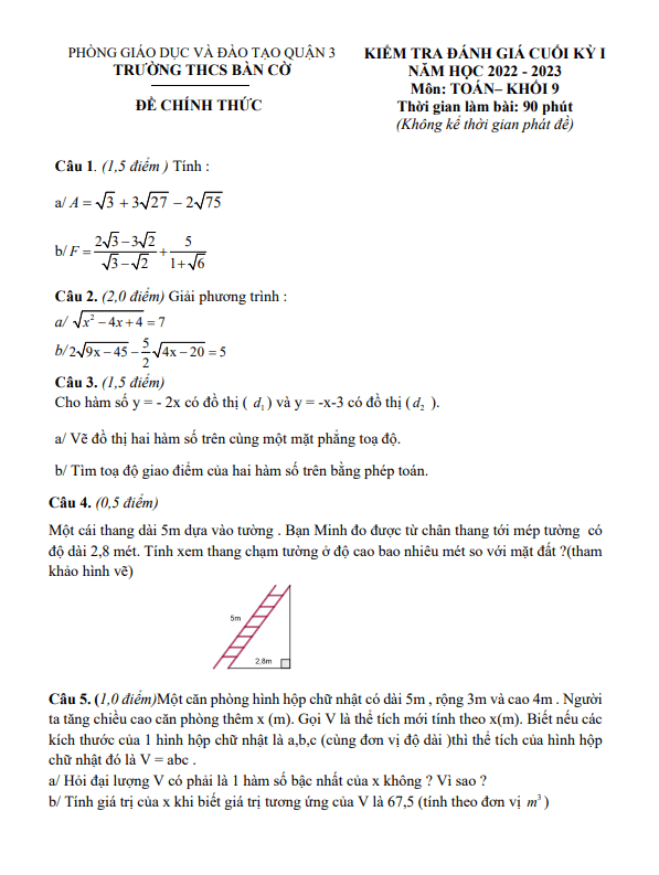 Đề tham khảo học kì 1 Toán 9 năm 2022 – 2023 trường THCS Bàn Cờ – TP HCM