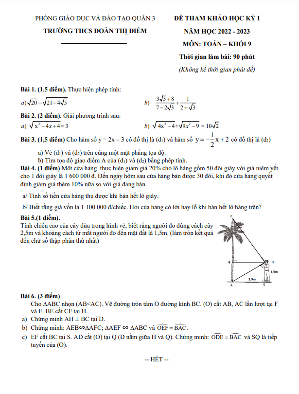 Đề tham khảo học kì 1 Toán 9 năm 2022 – 2023 trường THCS Đoàn Thị Điểm – TP HCM
