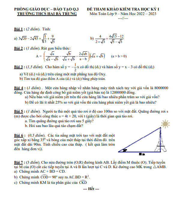 Đề tham khảo học kì 1 Toán 9 năm 2022 – 2023 trường THCS Hai Bà Trưng – TP HCM