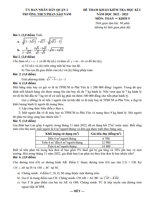 Đề tham khảo học kì 1 Toán 9 năm 2022 – 2023 trường THCS Phan Sào Nam – TP HCM