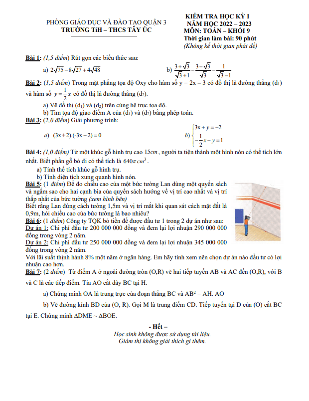 Đề tham khảo học kì 1 Toán 9 năm 2022 – 2023 trường TiH – THCS Tây Úc – TP HCM
