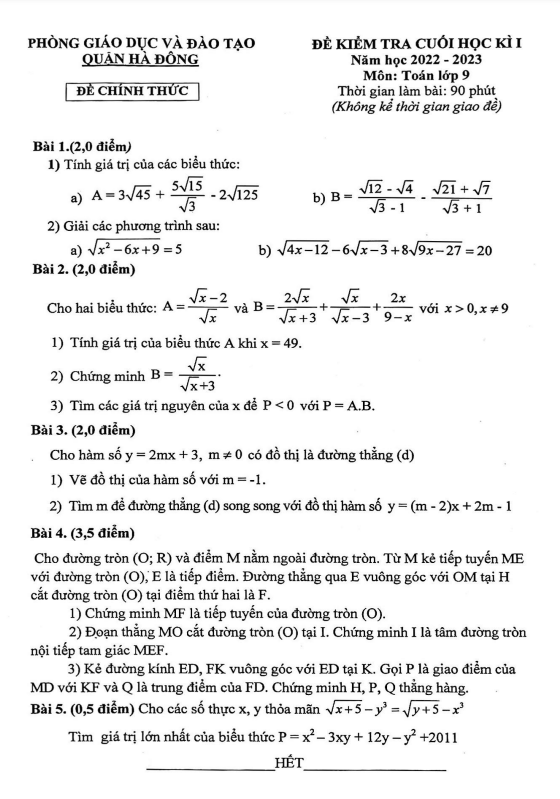 Đề cuối học kì 1 Toán 9 năm 2022 – 2023 phòng GD&ĐT Hà Đông – Hà Nội