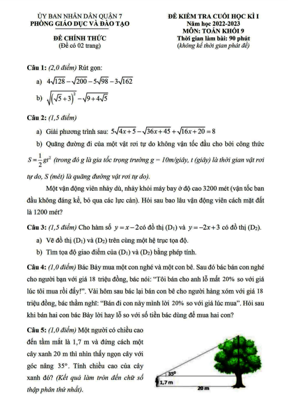 Đề cuối học kì 1 Toán 9 năm 2022 – 2023 phòng GD&ĐT Quận 7 – TP HCM