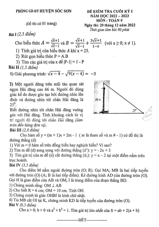 Đề cuối học kỳ 1 Toán 9 năm 2022 – 2023 phòng GD&ĐT Sóc Sơn – Hà Nội