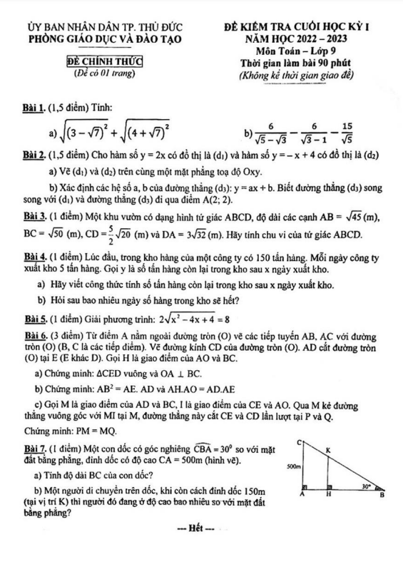 Đề cuối học kỳ 1 Toán 9 năm 2022 – 2023 phòng GD&ĐT Thủ Đức – TP HCM