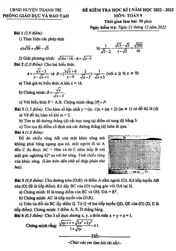 Đề học kì 1 Toán 9 năm 2022 – 2023 phòng GD&ĐT Thanh Trì – Hà Nội