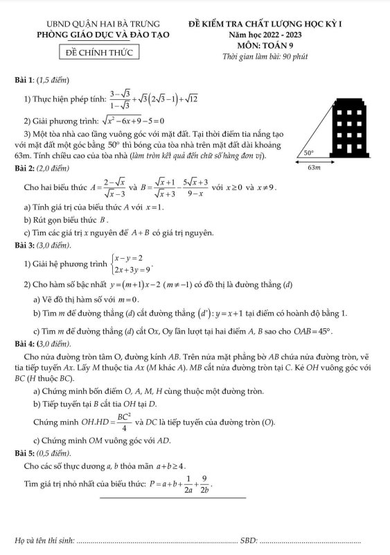 Đề học kỳ 1 Toán 9 năm 2022 – 2023 phòng GD&ĐT Hai Bà Trưng – Hà Nội