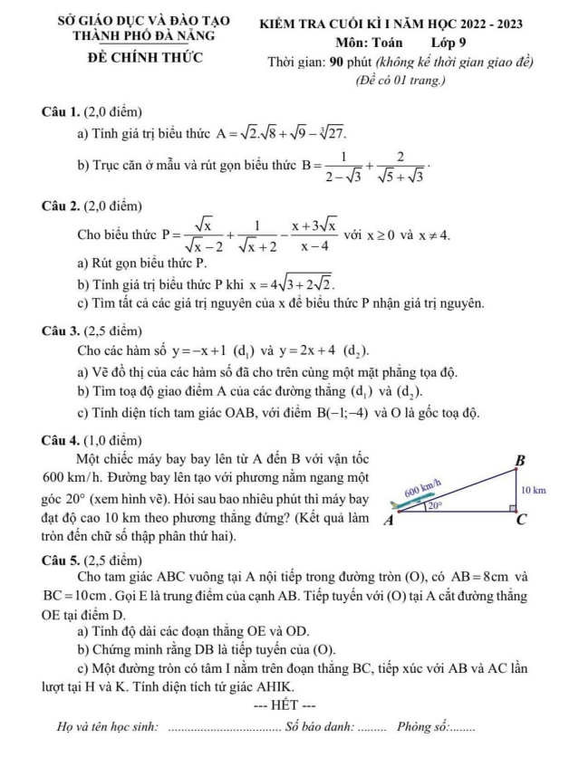 Đề kiểm tra cuối kì 1 Toán 9 năm 2022 – 2023 sở GD&ĐT Đà Nẵng