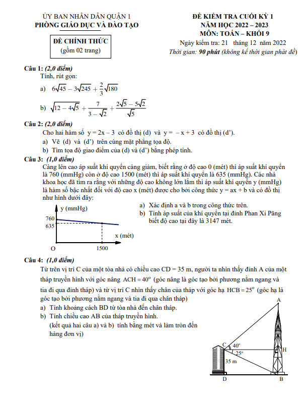 Đề kiểm tra cuối kỳ 1 Toán 9 năm 2022 – 2023 phòng GD&ĐT Quận 1 – TP HCM