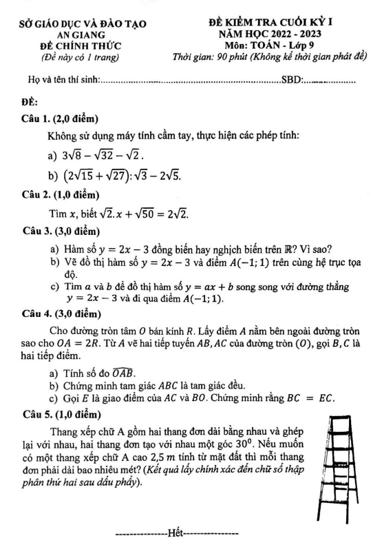 Đề kiểm tra cuối kỳ 1 Toán 9 năm 2022 – 2023 sở GD&ĐT An Giang