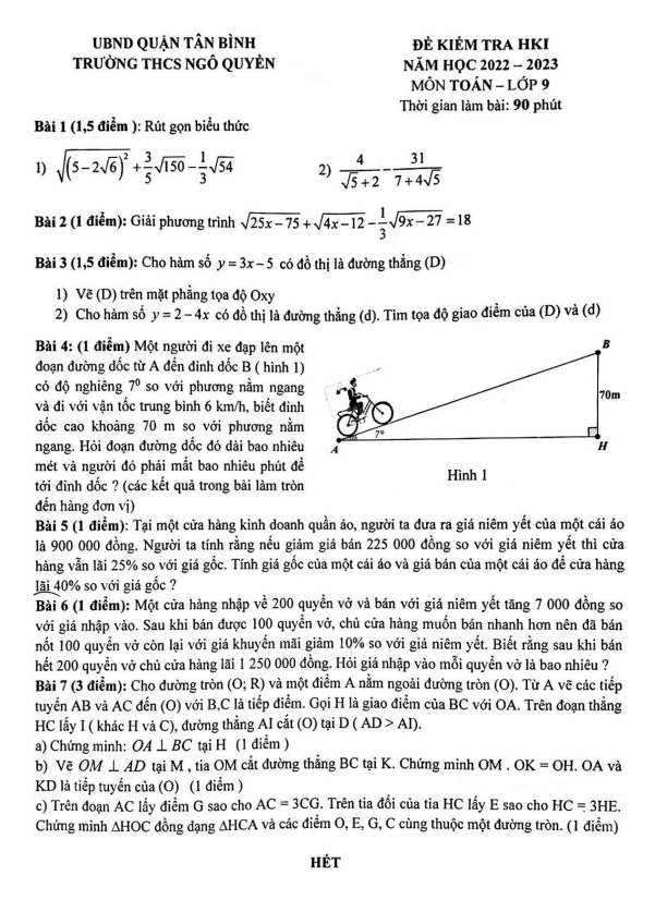 Đề kiểm tra HK1 Toán 9 năm 2022 – 2023 trường THCS Ngô Quyền – TP HCM