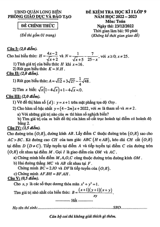 Đề kiểm tra học kì 1 Toán 9 năm 2022 – 2023 phòng GD&ĐT Long Biên – Hà Nội