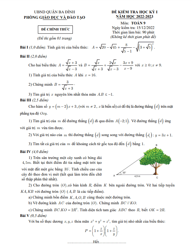 Đề kiểm tra học kỳ 1 Toán 9 năm 2022 – 2023 phòng GD&ĐT Ba Đình – Hà Nội