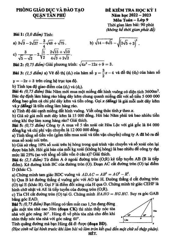 Đề kiểm tra học kỳ 1 Toán 9 năm 2022 – 2023 phòng GD&ĐT Tân Phú – TP HCM