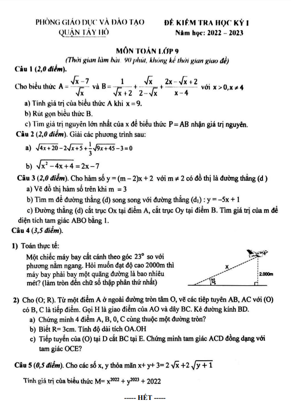 Đề kiểm tra học kỳ 1 Toán 9 năm 2022 – 2023 phòng GD&ĐT Tây Hồ – Hà Nội