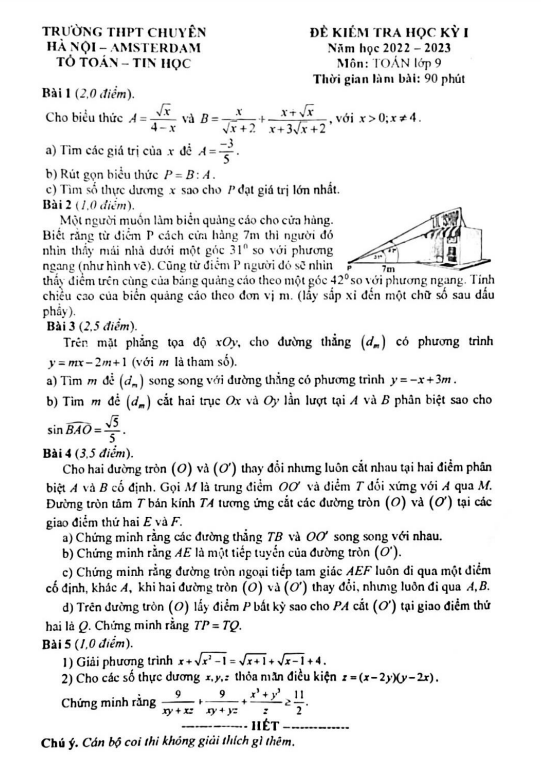Đề thi học kỳ 1 Toán 9 năm 2022 – 2023 trường THPT chuyên Hà Nội – Amsterdam