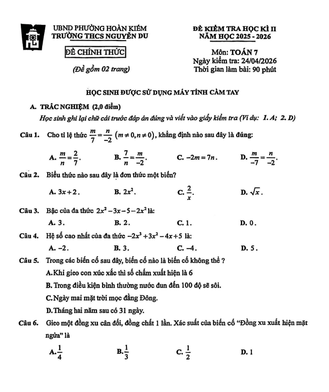 • Đề học kì 2 Toán 7 năm 2025 – 2026 trường THCS Nguyễn Du – Hà Nội
