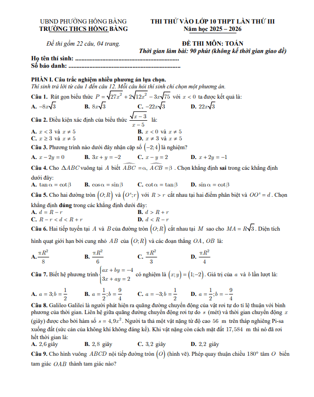 • Đề thi thử vào lớp 10 môn Toán lần 3 năm 2026 trường THCS Hồng Bàng – Hải Phòng