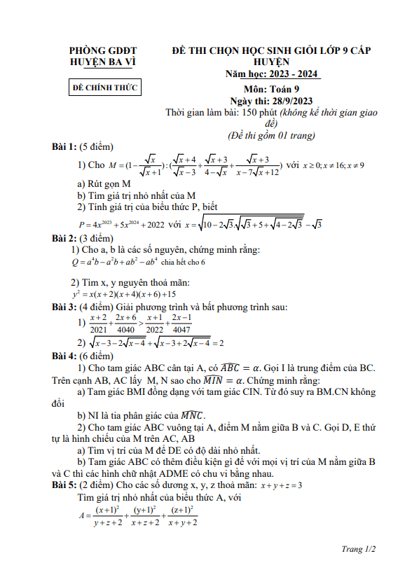 Đề học sinh giỏi Toán 9 cấp huyện năm 2023 – 2024 phòng GD&ĐT Ba Vì – Hà Nội