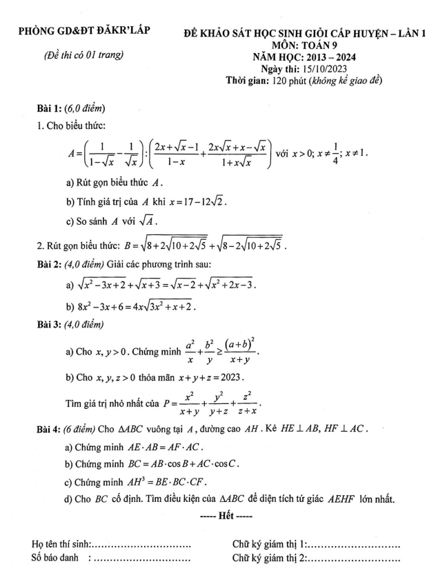 Đề học sinh giỏi Toán 9 lần 1 năm 2023 – 2024 phòng GD&ĐT Đắk R’Lấp – Đắk Nông