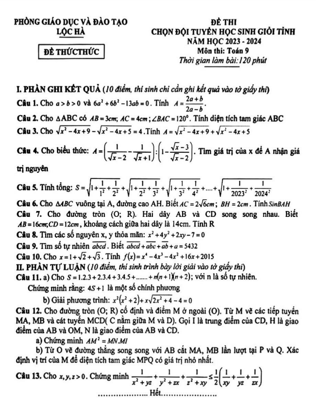 Đề học sinh giỏi Toán 9 năm 2023 – 2024 phòng GD&ĐT Lộc Hà – Hà Tĩnh
