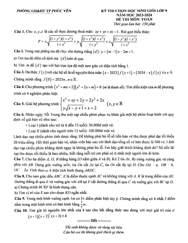 Đề học sinh giỏi Toán 9 năm 2023 – 2024 phòng GD&ĐT Phúc Yên – Vĩnh Phúc