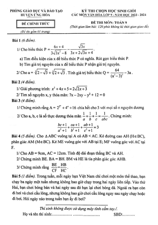 Đề học sinh giỏi Toán 9 năm 2023 – 2024 phòng GD&ĐT Ứng Hòa – Hà Nội
