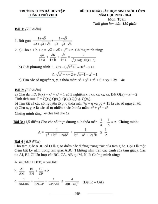 Đề học sinh giỏi Toán 9 năm 2023 – 2024 trường THCS Hà Huy Tập – Nghệ An