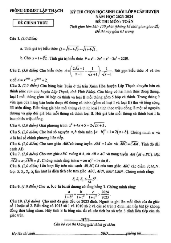 Đề HSG Toán 9 cấp huyện năm 2023 – 2024 phòng GD&ĐT Lập Thạch – Vĩnh Phúc