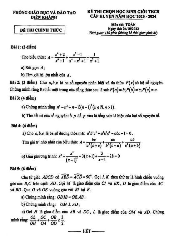 Đề HSG Toán THCS cấp huyện năm 2023 – 2024 phòng GD&ĐT Diên Khánh – Khánh Hòa
