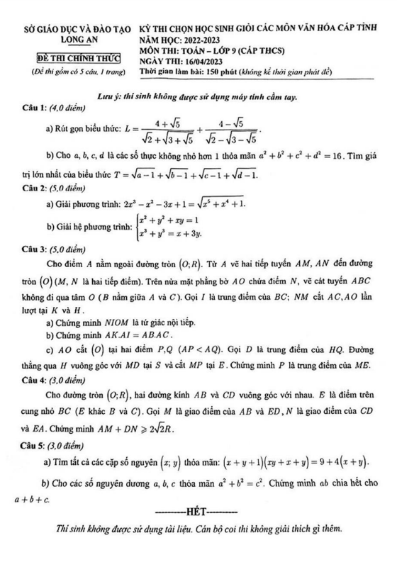 Đề học sinh giỏi cấp tỉnh Toán 9 năm 2022 – 2023 sở GD&ĐT Long An