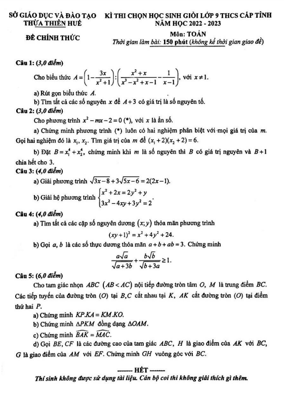 Đề học sinh giỏi Toán 9 cấp tỉnh năm 2022 – 2023 sở GD&ĐT Thừa Thiên Huế