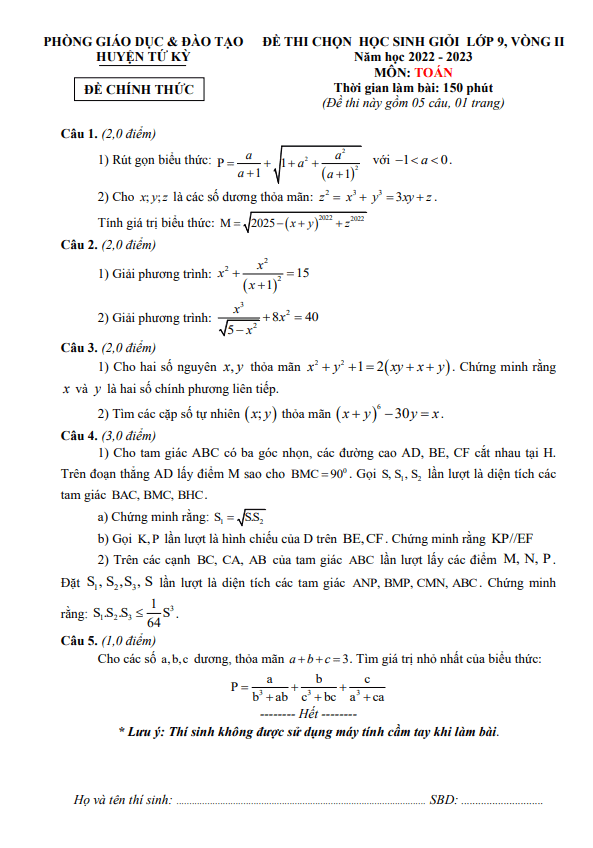 Đề học sinh giỏi Toán 9 vòng 2 năm 2022 – 2023 phòng GD&ĐT Tứ Kỳ – Hải Dương