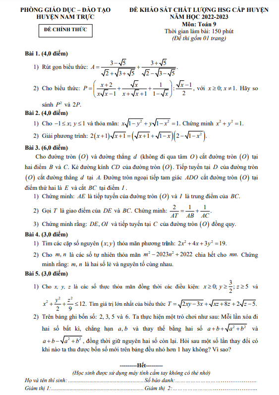 Đề HSG cấp huyện Toán 9 năm 2022 – 2023 phòng GD&ĐT Nam Trực – Nam Định