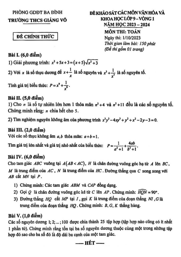 Đề khảo sát Toán 9 vòng 1 năm 2023 – 2024 trường THCS Giảng Võ – Hà Nội