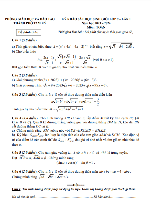 Đề khảo sát HSG Toán 9 lần 1 năm 2023 – 2024 phòng GD&ĐT Tam Kỳ – Quảng Nam