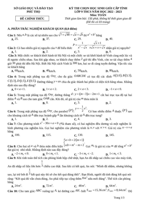Đề học sinh giỏi cấp tỉnh Toán 9 năm 2022 – 2023 sở GD&ĐT Phú Thọ