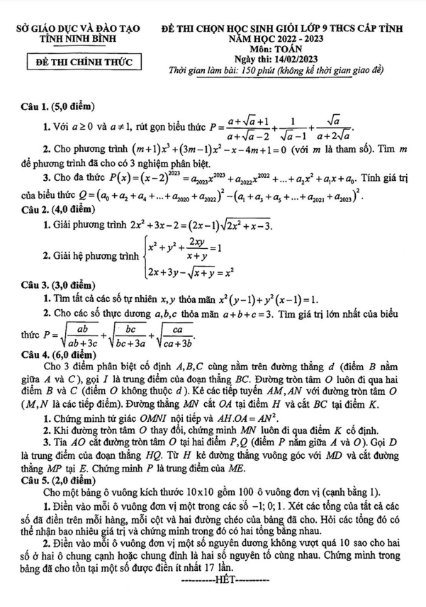 Đề học sinh giỏi Toán 9 cấp tỉnh năm 2022 – 2023 sở GD&ĐT Ninh Bình