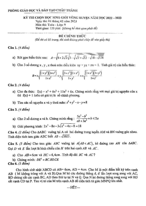 Đề học sinh giỏi Toán 9 năm 2022 – 2023 phòng GD&ĐT Châu Thành – Bến Tre