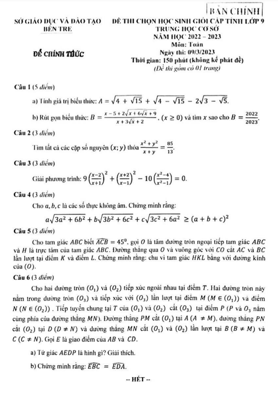 Đề học sinh giỏi cấp tỉnh Toán 9 năm 2022 – 2023 sở GD&ĐT Bến Tre