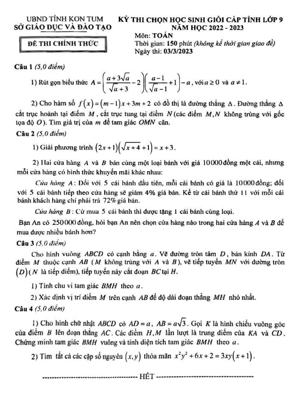 Đề học sinh giỏi cấp tỉnh Toán 9 năm 2022 – 2023 sở GD&ĐT Kon Tum