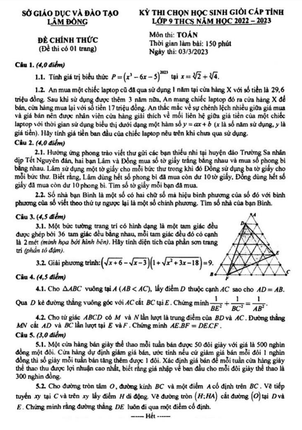 Đề học sinh giỏi cấp tỉnh Toán 9 năm 2022 – 2023 sở GD&ĐT Lâm Đồng