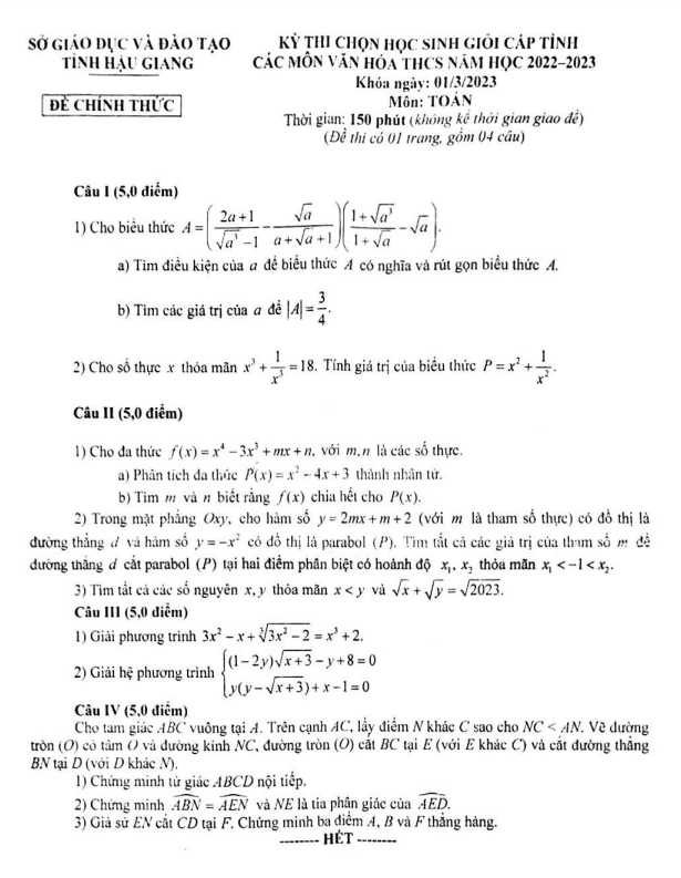 Đề học sinh giỏi cấp tỉnh Toán THCS năm 2022 – 2023 sở GD&ĐT Hậu Giang