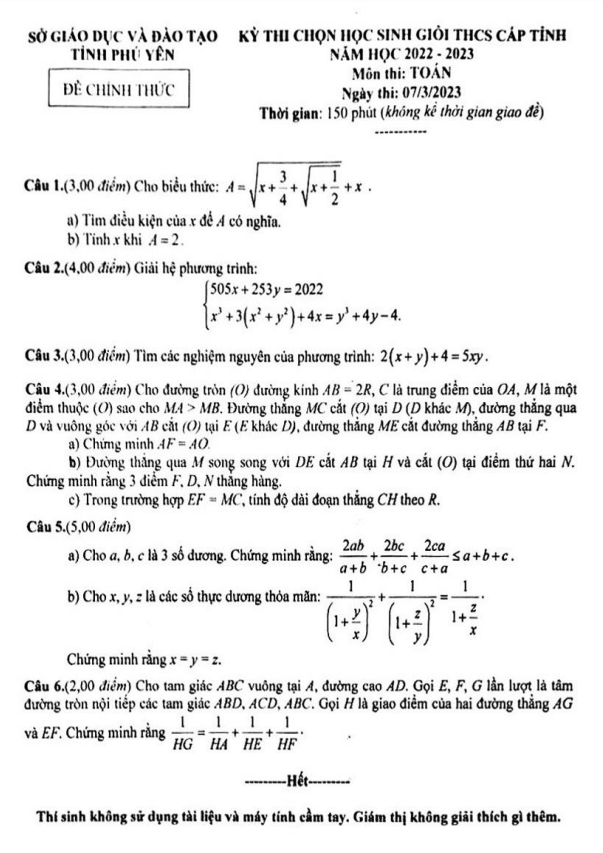 Đề học sinh giỏi cấp tỉnh Toán THCS năm 2022 – 2023 sở GD&ĐT Phú Yên