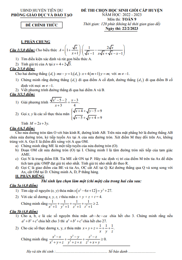 Đề học sinh giỏi huyện Toán 9 năm 2022 – 2023 phòng GD&ĐT Tiên Du – Bắc Ninh
