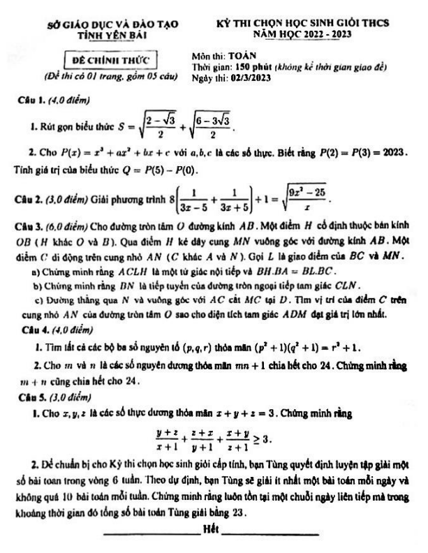 Đề học sinh giỏi Toán THCS năm 2022 – 2023 sở GD&ĐT Yên Bái