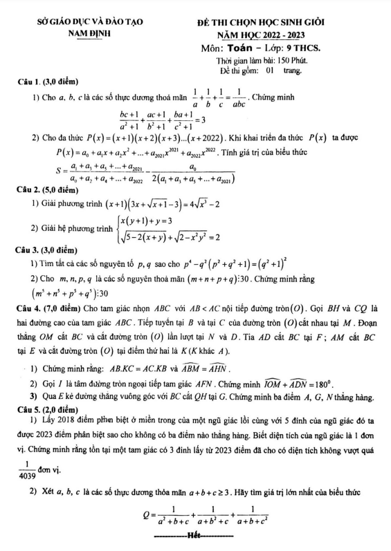 Đề thi chọn học sinh giỏi Toán 9 năm 2022 – 2023 sở GD&ĐT Nam Định