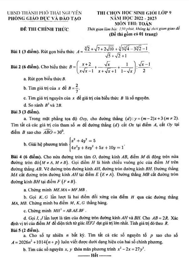 Đề thi học sinh giỏi Toán 9 năm 2022 – 2023 phòng GD&ĐT thành phố Thái Nguyên